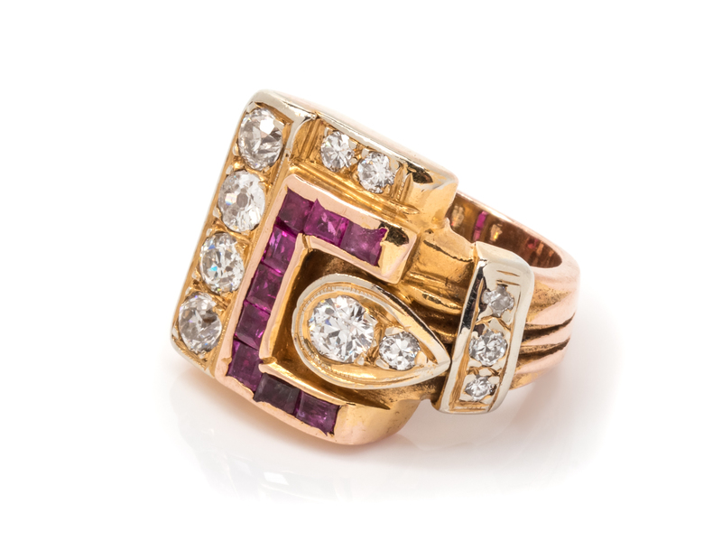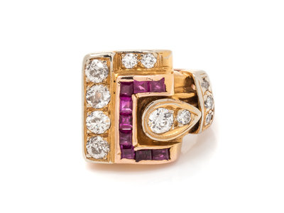 A Rose Gold, Diamond and Ruby Buckle Motif Ring,