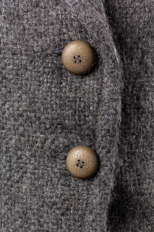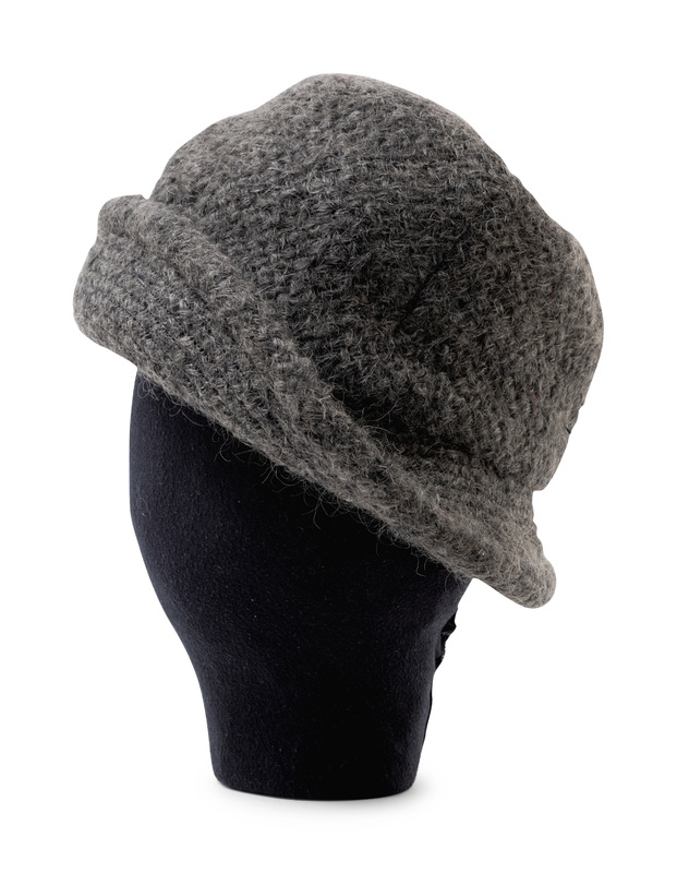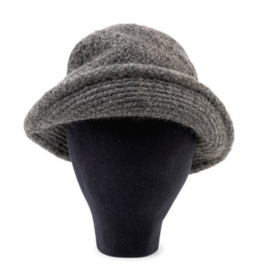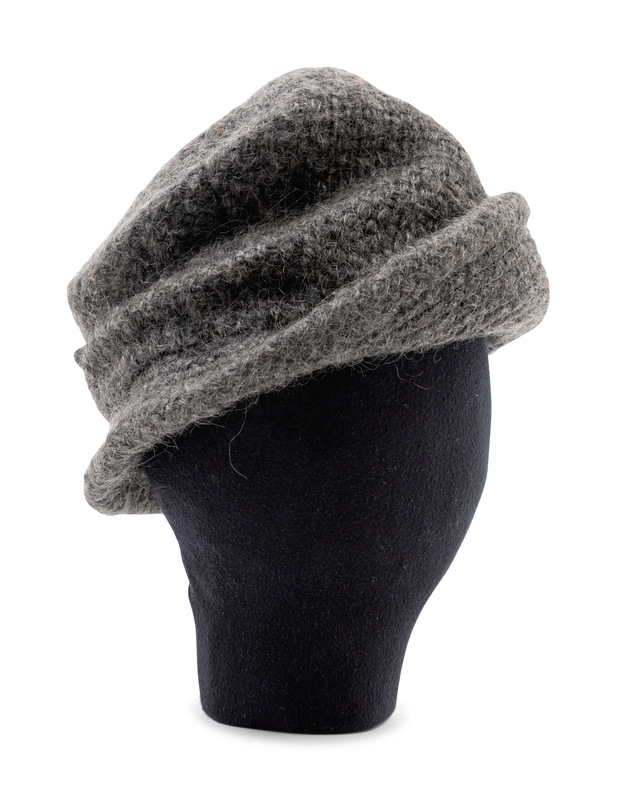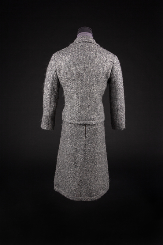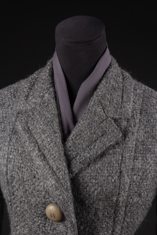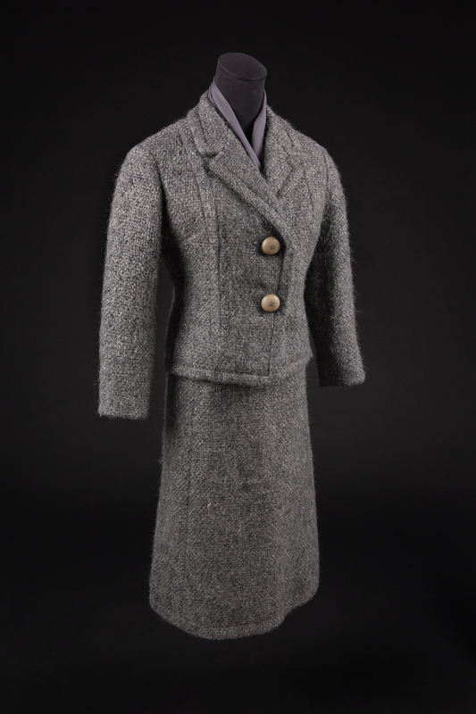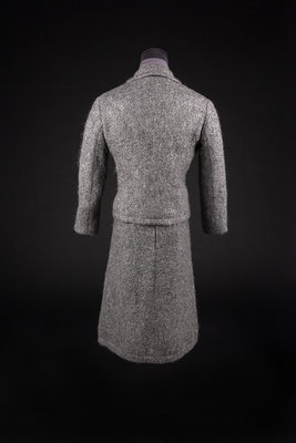 Ensemble consists of dress, jacket, scarf and hat. The main seams of the ensemble are sewn by machine while the inside, finishing stitches are done by hand. The main fabric is a loosely woven grey wool. The jacket has a notched collar, long sleeves and a center front two-button closure. The a-line skirt is connected to a sleeveless grey silk bodice and closes down the center back with a zip. The scarf is made of matching grey silk chiffon and the hat is made with a thin brim and gathered on one side.