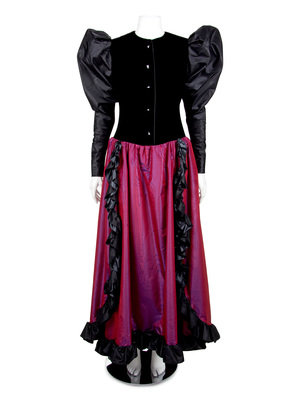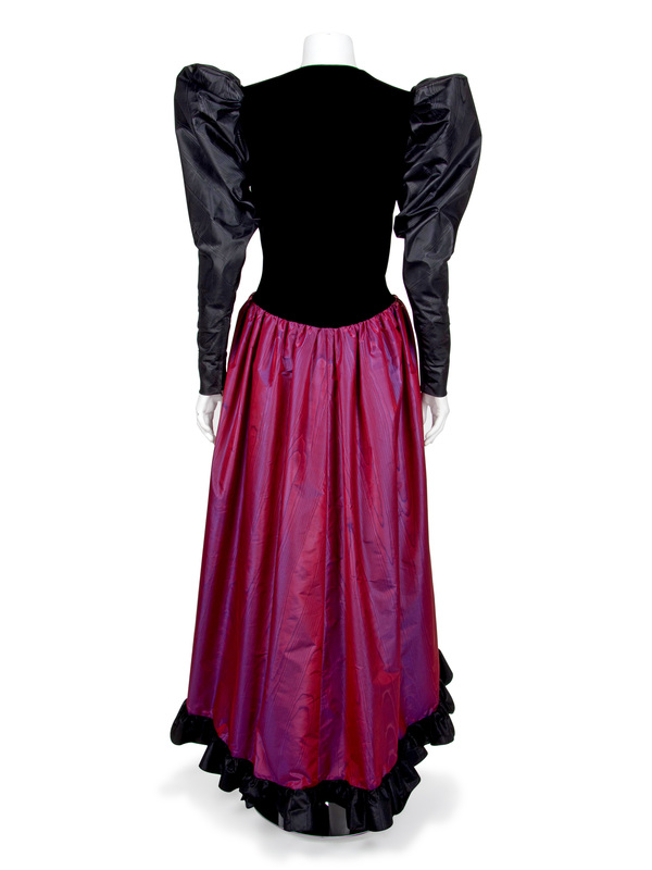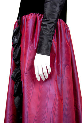 The first; a Givenchy evening dress with black silk velvet bodice, black moire taffeta full sleeves, magenta moire taffeta skirt with black ruffle trim, and front button and hidden snap closure.
