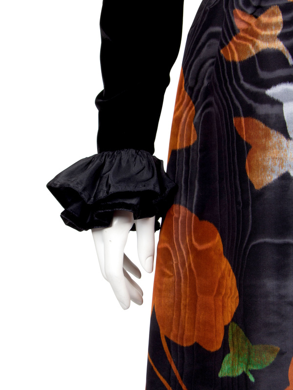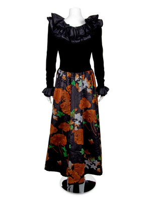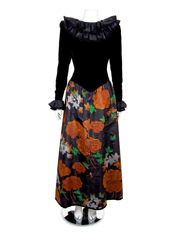 The second; a Givenchy evening dress with black silk velvet bodice with low pointed waist, long black satin sleeves, black satin ruffle trim at cuffs and collar, black moire silk skirt with autumnal floral print, and back zip closure.
