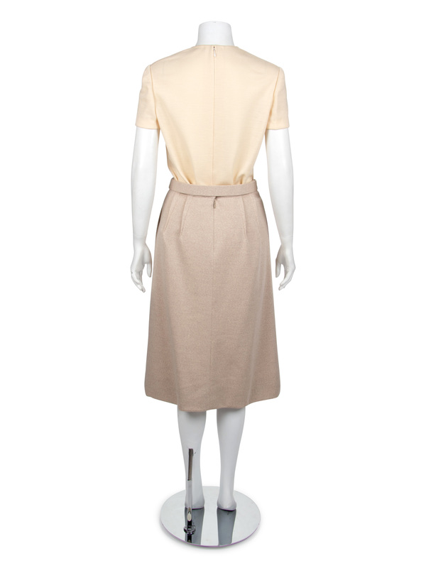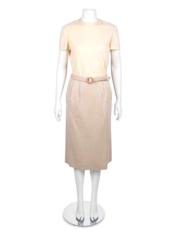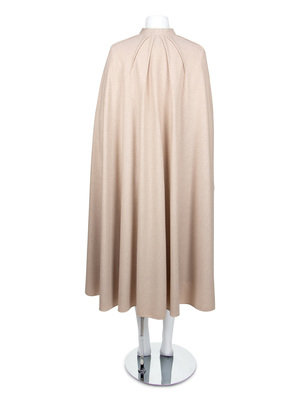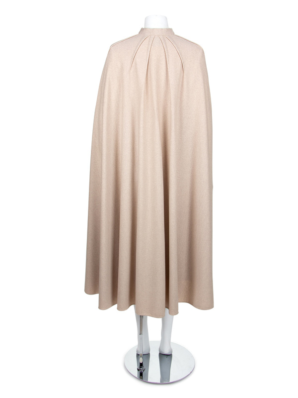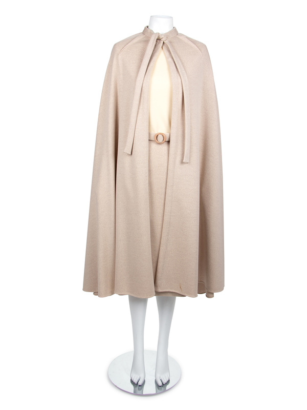 The third; a Bill Blass day ensemble with long tan jersey cape with tie and snap closure at neck, cream jersey blouse with short sleeves and back zip, and tan jersey straight skirt with self-covered belt and back zip closure.