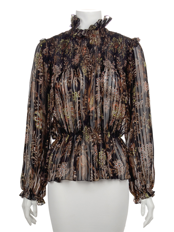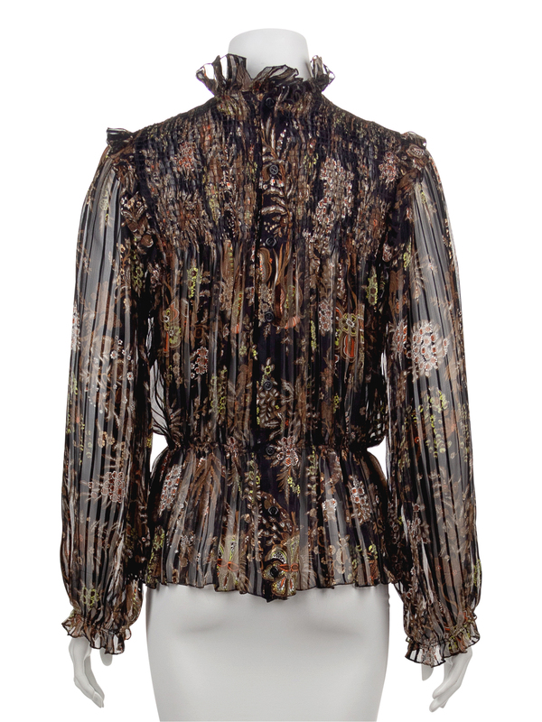 Black sheer blouse printed with a floral design with stand collar, long sleeves gathered into a ruffled cuff, smocked yoke and a center back button closure.