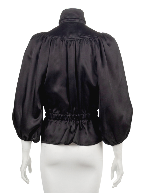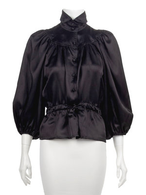 Black satin blouse with fold down collar, full gathered sleeves, self fabric belt and center front button closure.