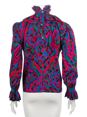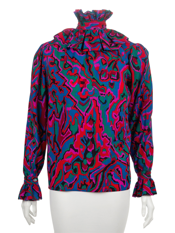 Blue red and green print blouse with stand collar with ruffle around the neck, long sleeves with ruffled hem and a center front buttoned placket.