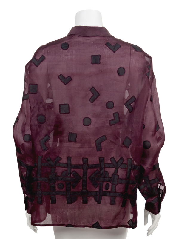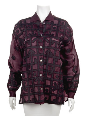 The second; purple chiffon blouse with appliqued black abstract pattern, side vents, and front button closure.
