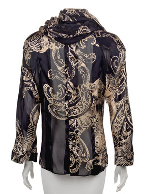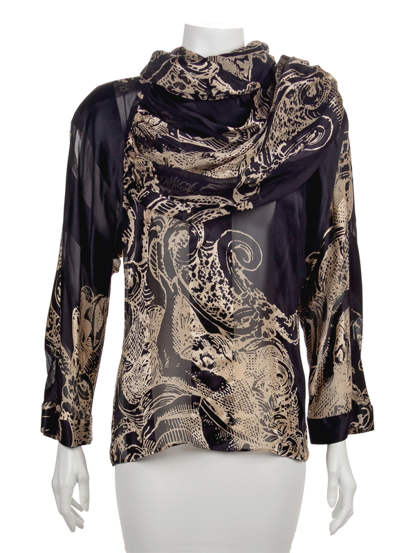 The first; a black and tan printed silk chiffon blouse with alternating silk satin panels, a large attached shawl, raglan sleeves, and back button closure.