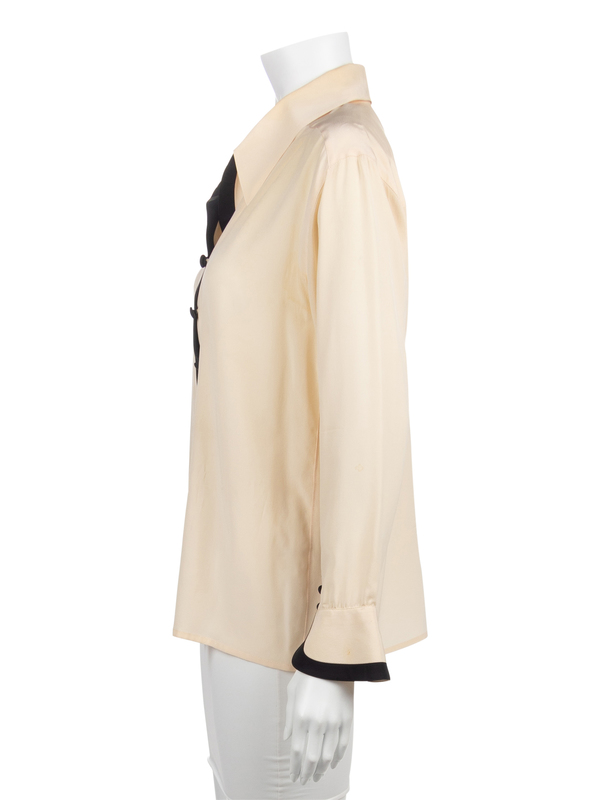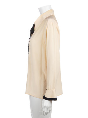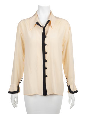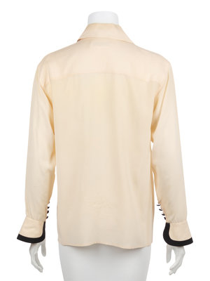 The third; Karl Lagerfeld cream silk crepe blouse with black trim and front button closure with black fabric-covered buttons.