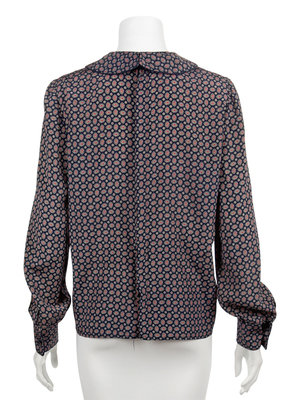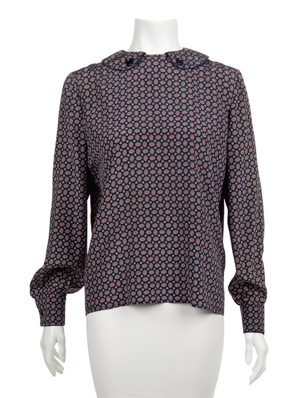 The second; Valentino Boutique navy silk blouse with red paisley print, buttoned Peter Pan collar, straight fit, and back button closure.