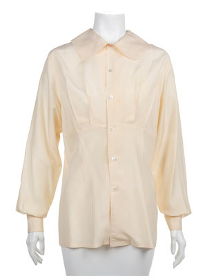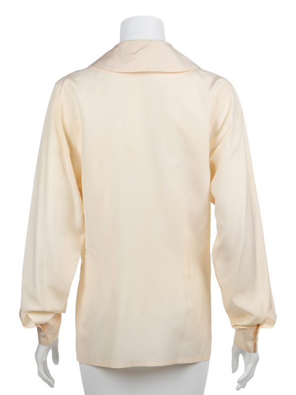 The first; Comme des Garçons off-white silk blouse with curved collar, bust pleats, high waist, and front button closure with mother-of-pearl style buttons.
