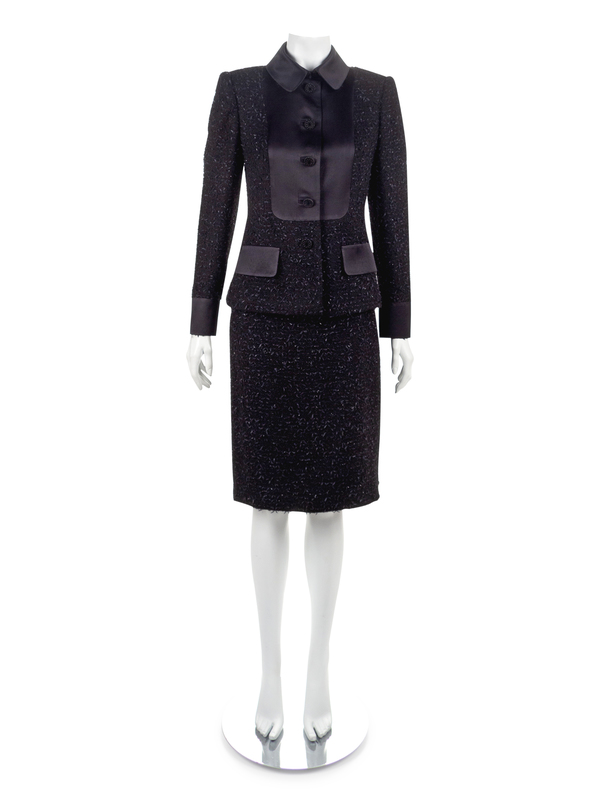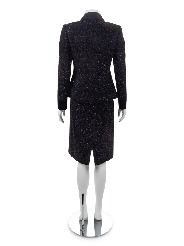 Black bouclé and satin jacket and skirt. The jacket is cut with a fold-down collar set into a crew neckline, with long sleeves with a vented cuff, front faux pocket flaps and a center front black-button closure. The straight skirt is knee-length with a center back invisible zip. The skirt is fully lined.