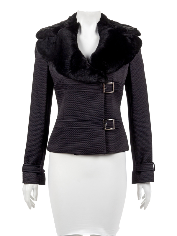 Black quilted satin jacket with black chinchilla notched lapel, fitted sleeves with wrist buckles, off-center double belted front closure.