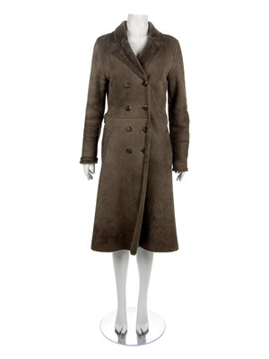 Green shearling coat with notched collar, long sleeves and double breasted button closure.