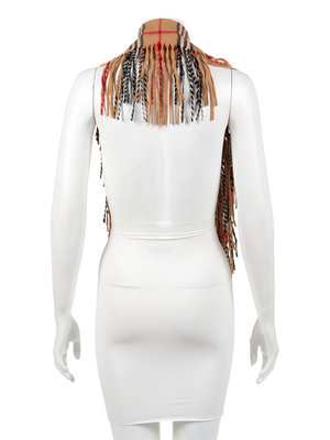 Cashmere scarf in signature Burberry tan, red, black, and cream check, with fringe running along both sides.