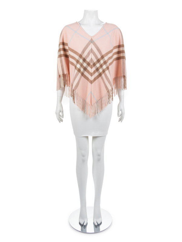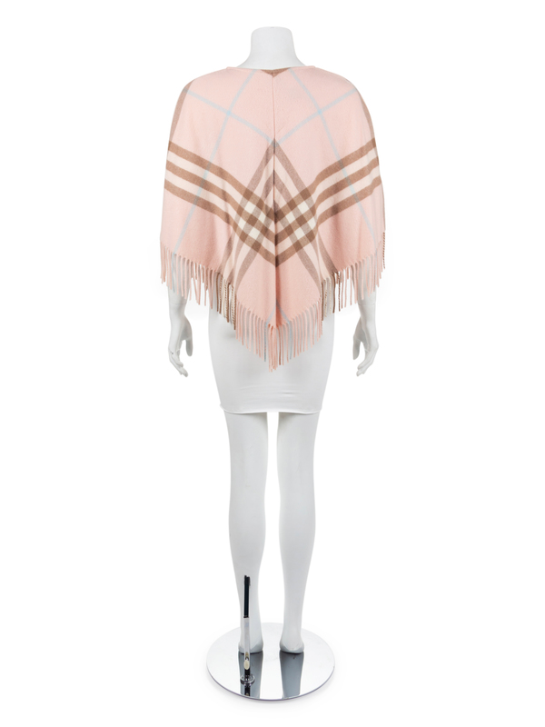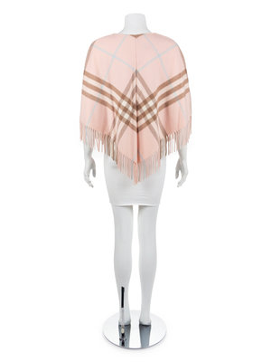 Wool and cashmere poncho, in signature Burberry check in pale pink, pale blue, tan, and off-white, v-neckline, and fringed pointed hem.