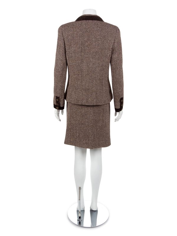 Jacket and skirt made of brown and white wool trimmed with dark brown wool. The jacket has a fold down collar, long sleeves, patch pockets and a CC button closure. The sleeve hem also closes with the same CC buttons. The jacket is lined with brown fabric woven with the CC logo and is finished at the inside hem with a chain.