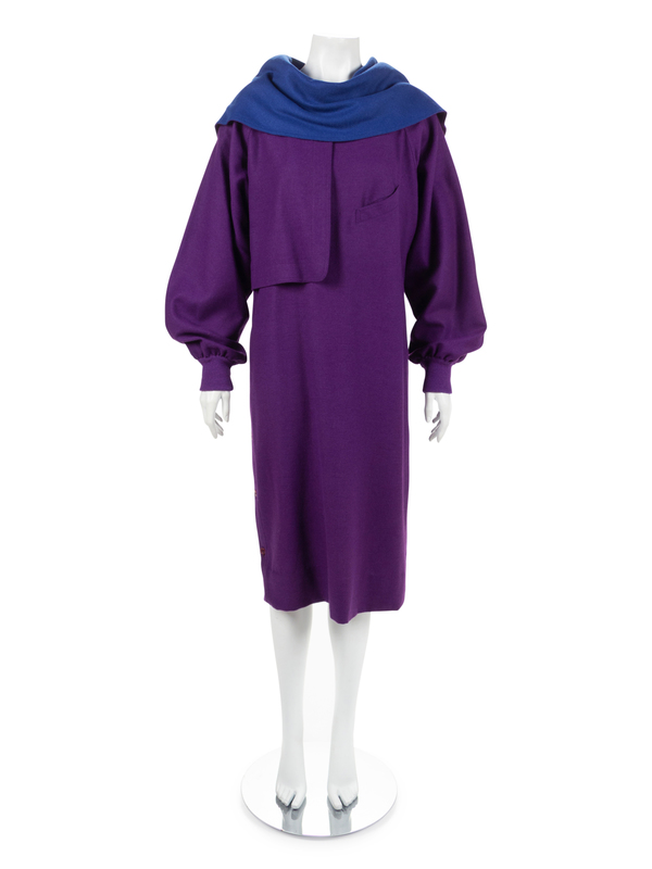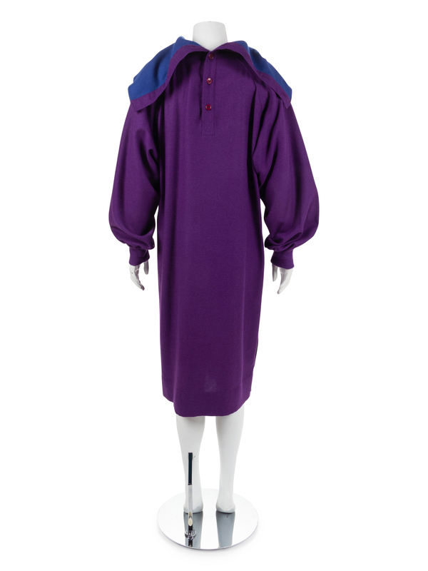 Purple wool and angora coat dress with blue cowl collar, trench-style right chest panel, slanted chest pocket, full sleeves with banded cuffs, button-up closure along right skirt seam, and button back closure at neck.