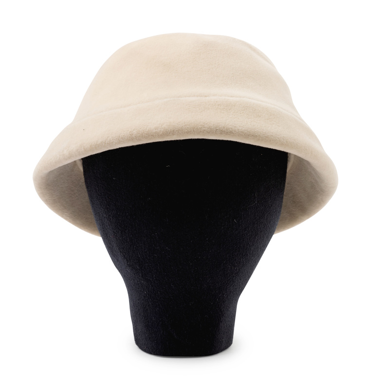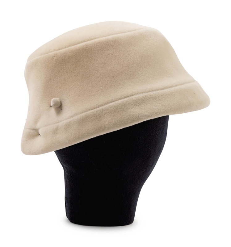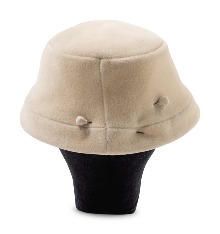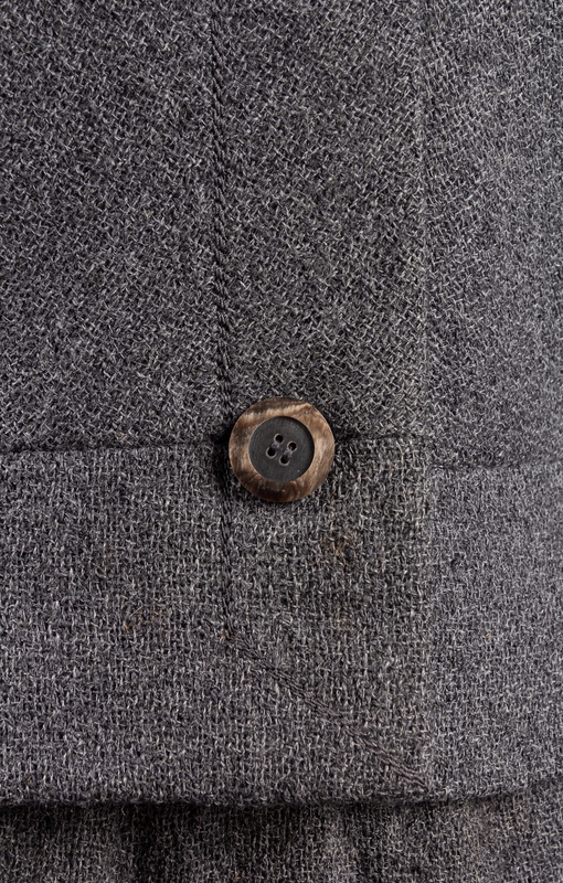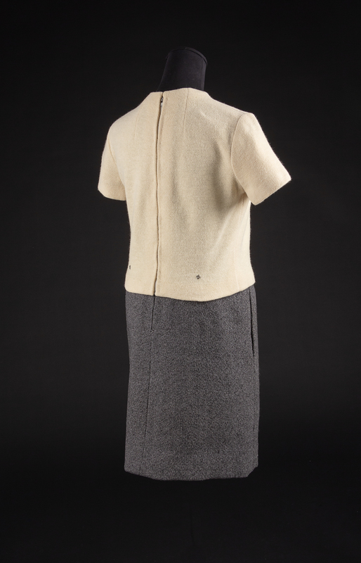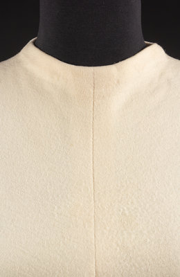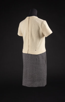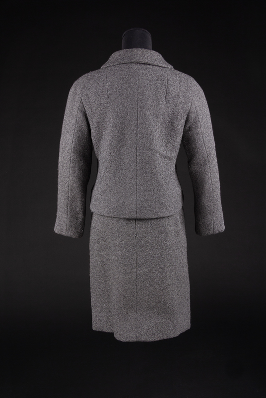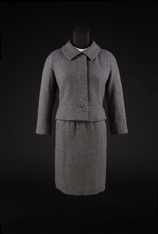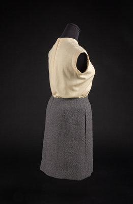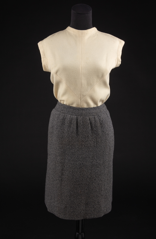 Ensemble consists of jacket, skirt, two bodices and belt. The main seams of all items are sewn by machine while the inner, finishing stitches are sewn by hand. The jacket and skirt are made of grey wool. The jacket front and sleeves are cut in one piece with a fold-down collar and center front covered button closure with one exposed button at the waistline. The a-line skirt has a pocket over each hip, is gathered into the waistline and closes down the center back with a zip. Both bodices are made of a cream wool knit with a crew neckline, short or cap sleeves and a center back zip. Bodice One is meant to be tucked into the skirt, while Bodice Two has a finished hem. The belt is made of grey wool. The hat is of cream velvet with a shallow brim.