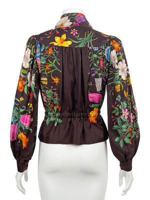 Brown satin botanical floral and insect print with full sleeves, elasticized drawstring at low waist, and front button closure.