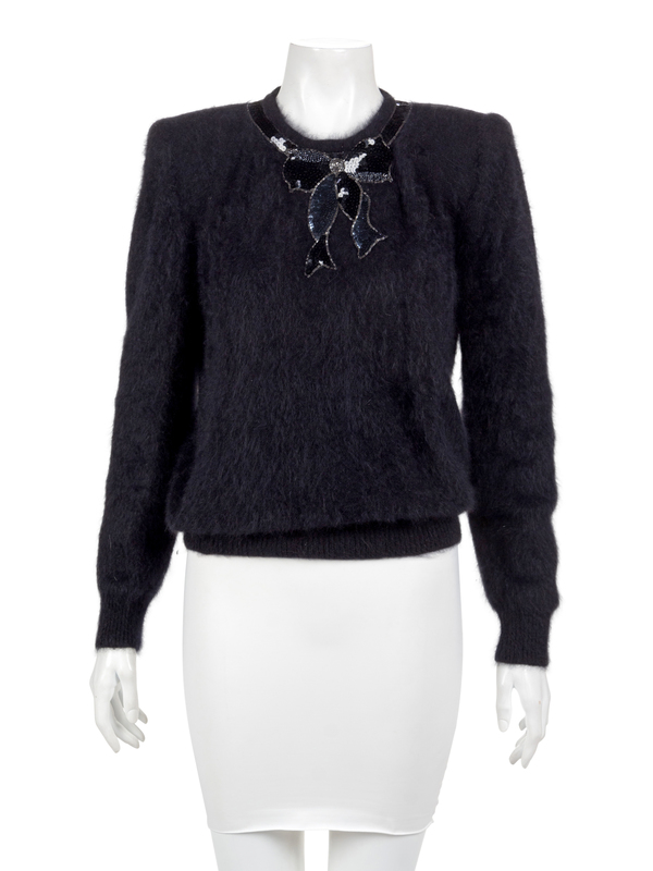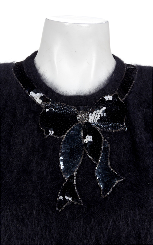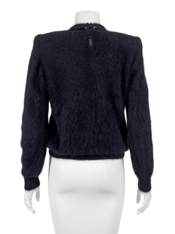 Black angora blend sweater trimmed with black sequins in bow motif around jewel neckline, shoulder pads, ribbed knit at sleeve cuffs and bottom hem, and closed with three buttons at the center back neck.