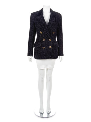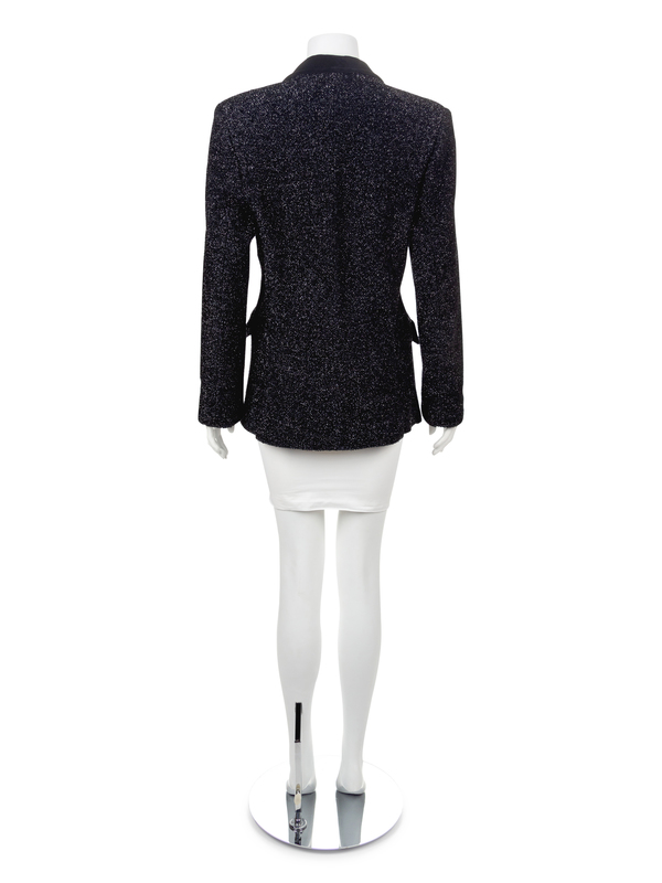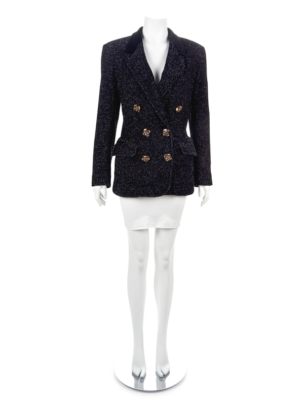 Black mylar piled jacket with black silk velvet collar, flap pockets, double breasted with over sized gold, black, and rhinestone buttons.