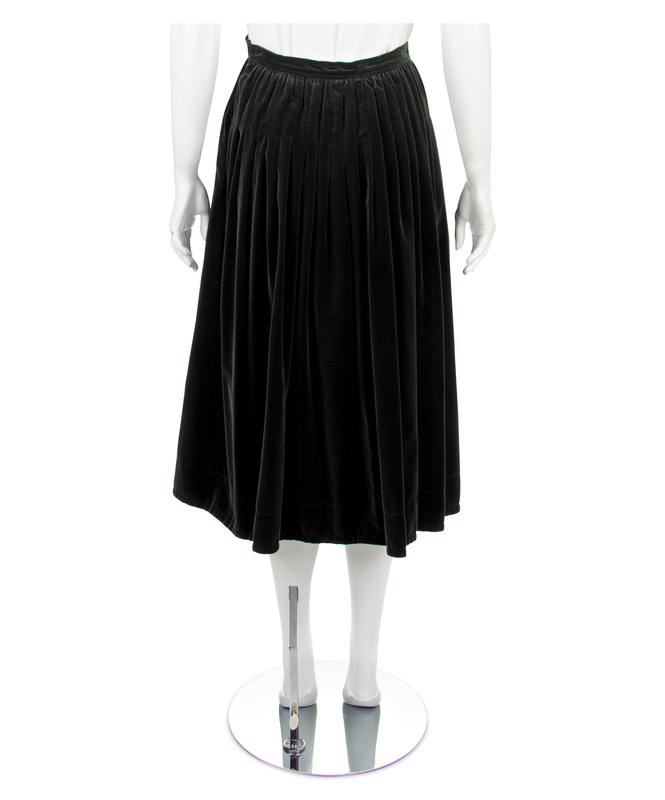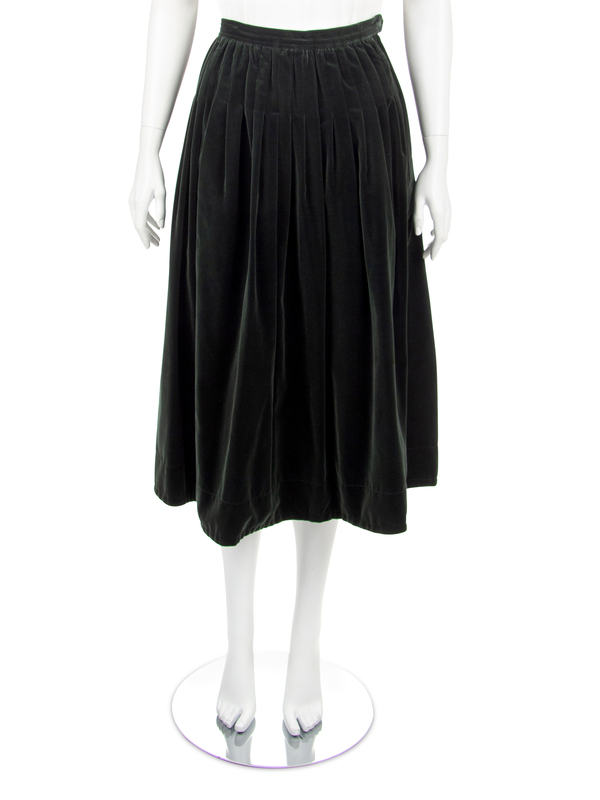 Pleated forest green velvet midi skirt with narrow waistband, side seam pockets and side zip closure.