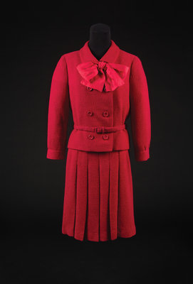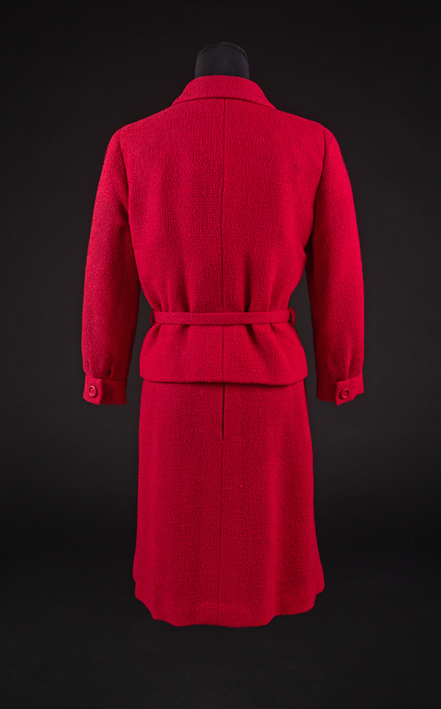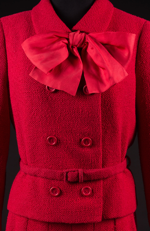 Ensemble consists of jacket, skirt and two belts made of red loosely wool boucle. The main seams of all items are sewn by machine with the inner, finishing work done by hand sewing. The jacket has a fold down collar, long sleeves and a double-breasted button closure with a large red silk bow permanently tied at the neck. The waist is cinched with a self-fabric belt. The a-line skirt is plain in the back with vertical knife pleats in the front and closes with a zip and a silk covered belt, which attaches with snaps.