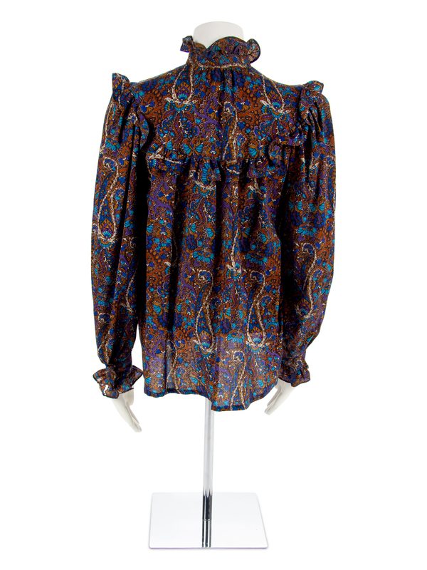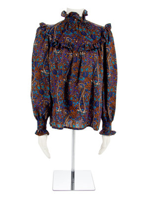 Brown, blue and white in a paisley print and cut in near identical style as the above blouse.