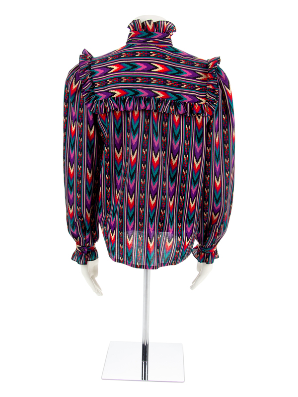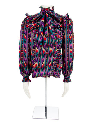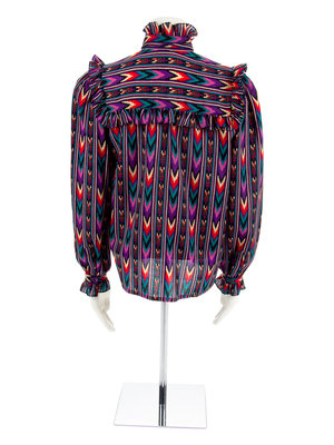 The first blouse is a multicolored print in a geometric pattern. The blouse is cut with a ruffled collar, long sleeves, attached necktie and a center front placket.