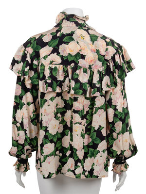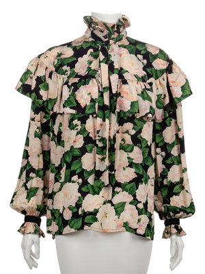 1) Green and pink floral print with stand collar, ruffled yoke, long sleeves and a center front button closure. The blouse is trimmed with a black velvet ribbon.