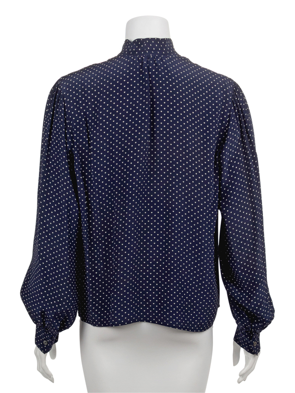 2) Blue silk blouse printed with white hearts with self-fabric tie at neckline, full sleeves gathered into a cuff and a buttoned placket at the center front.