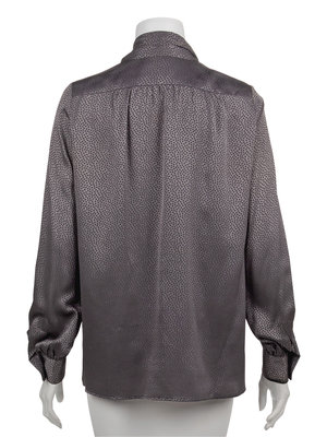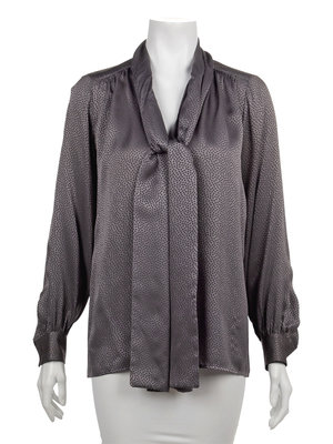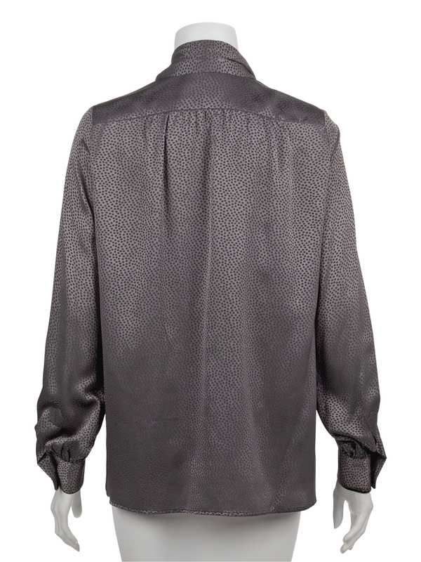 3) Grey silk blouse woven with small circles with self-fabric tie at neckline, full sleeves gathered into a cuff and a center front v-opening.