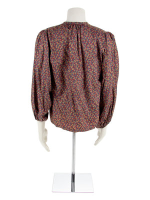 Blue tan and red floral bloom print blouse with a crew neckline with single button at center front and long full sleeves with a gathered hem.
