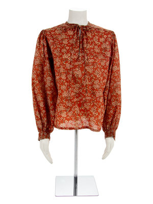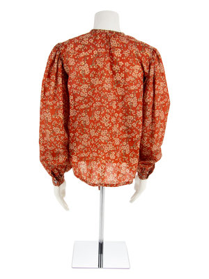 Orange blouse printed with floral blooms on branches with a self-fabric tie at the neckline, long sleeves gathered into a cuff.