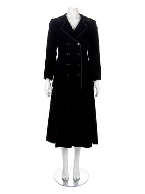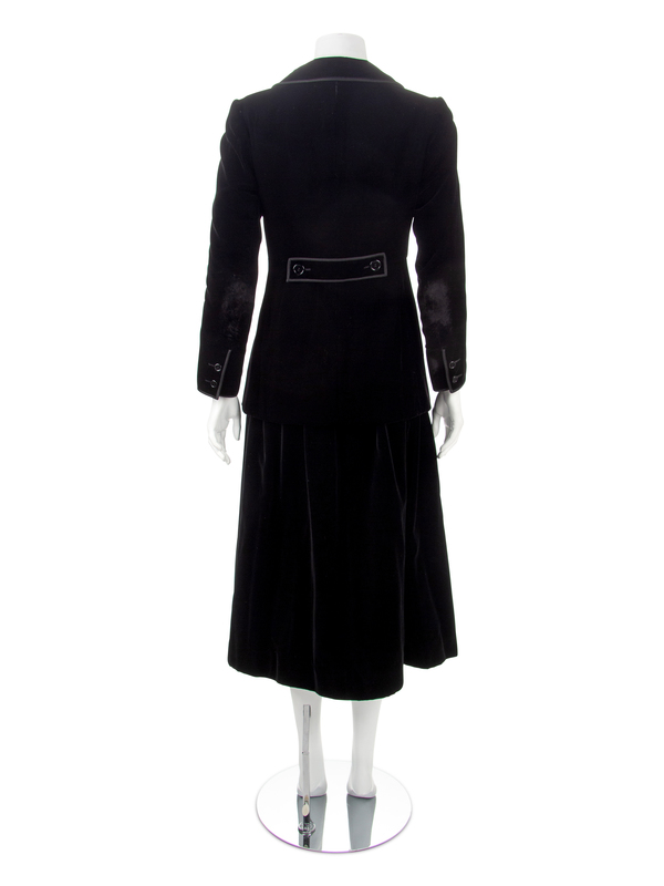The first; a black velvet double-breasted smoking jacket with black trim, hidden front pockets, back belt, and two spare buttons inside lapel. Haute Couture number #013183.