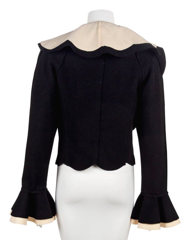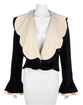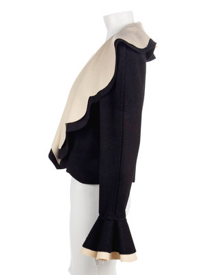 Black with cream contrast felted wool Olive Oyl cropped jacket with open front, cream scalloped collar, straight sleeves ending in dual-colored flounces, and exposed unfinished seam detail.