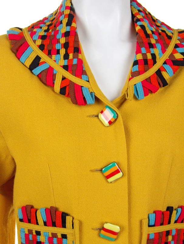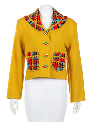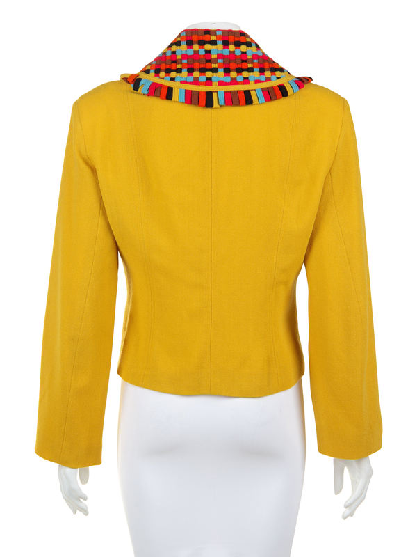 Cropped cotton jacket with multicolor woven collar and patch pockets, front button closure, square multicolor glass buttons, and padded shoulders.