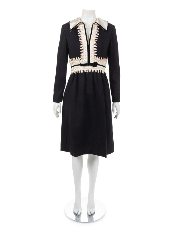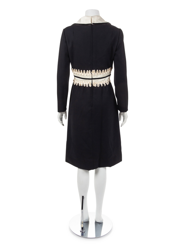 With cream satin collar, placket and waistband, off-white looped scallop and black velvet ribbon trim, black velvet bow at waist, back zip closure, and side seam pockets in skirt.