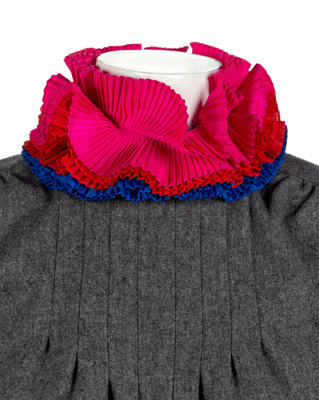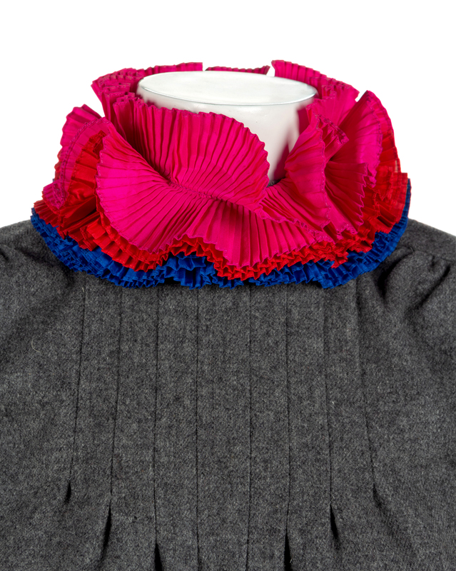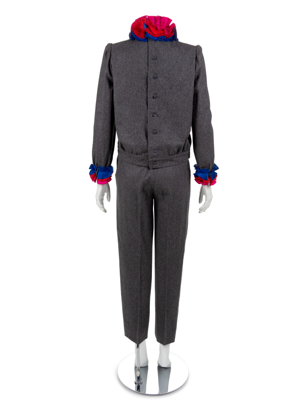A bomber-style jacket with banded hem, puffed shoulders, multi-color pleated ruffles at the neckline and sleeve hem, and front button closure; together with a matching high-waisted straight trousers with front patch pockets and a front zip closure.