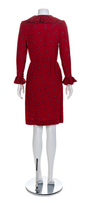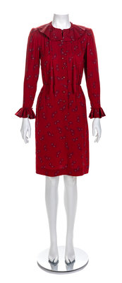 Red paisley print dress with a peplum collar, long sleeves with a peplum hem and straight skirt pleated into the wiastline. A center front button closure is finished with a self-fabric tie at the neckline.