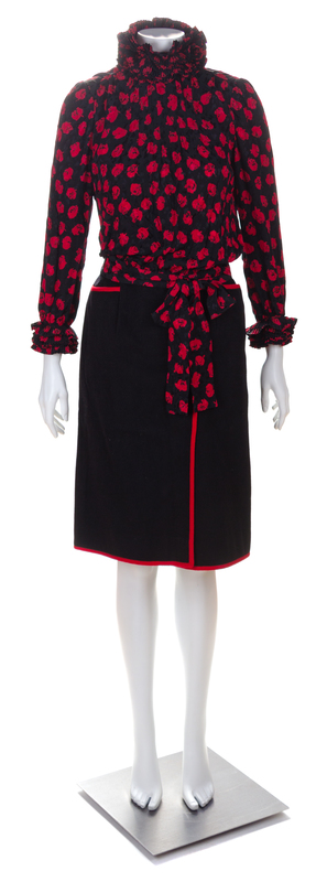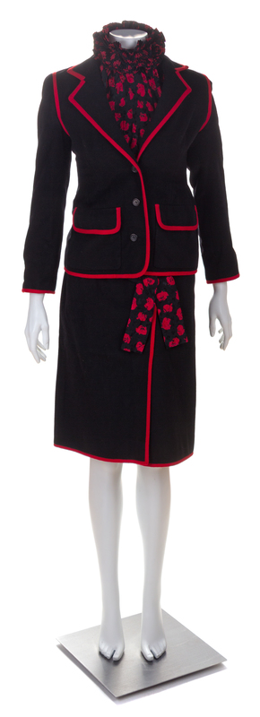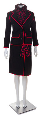 Comprised of a jacket with a notched collar, decorative red trim, front flap pockets and a button front closure; together with a matching wrap skirt with patch pockets and button front closure, paired with a black and red silk blouse with a pleated ruffle collar and cuffs and back button closure.
