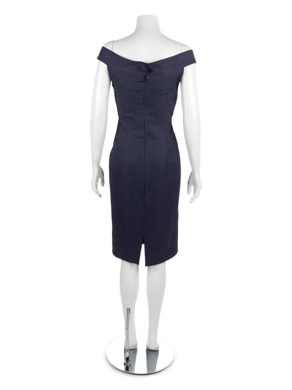 Gray-blue dress with off the shoulder neckline, slim pencil skirt with back vent, back zip closure, and black lining.