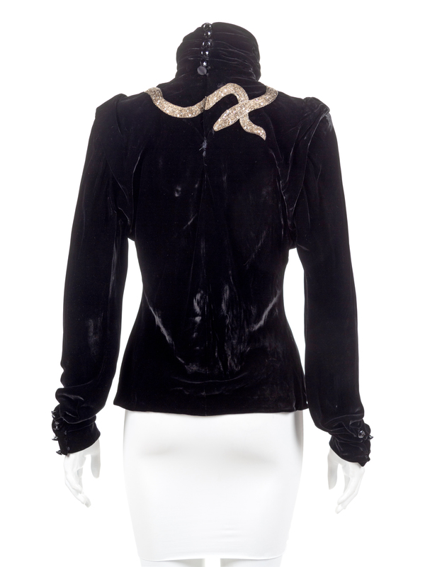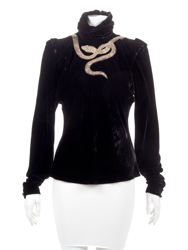 Black velvet evening blouse with button-back turtleneck, silvertone and goldtone metal threaded snake embellished with sequins and rhinestone eyes, and narrow sleeves with snap closure.