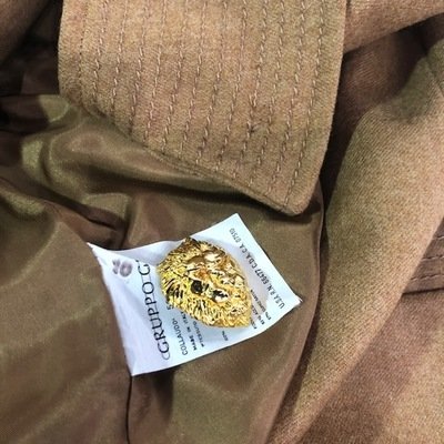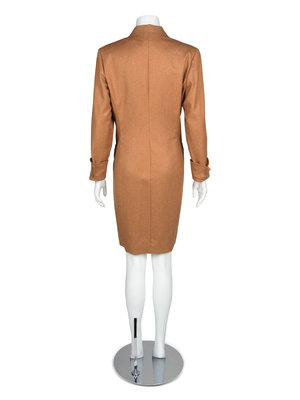 Brown wool dress with top-stitched and pointed collar, long sleeves with wide cuff and a center front button closure of large goldtone lion heads with jeweled eyes. A horizontal pocket on each hip. The dress if fully lined.