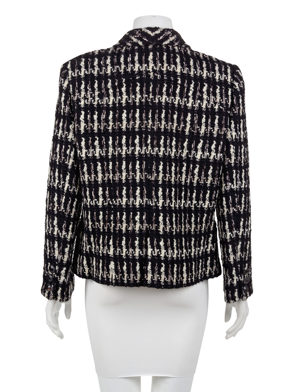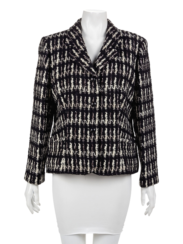 Black and white check jacket with notched lapels, long sleeves, hip pockets and a center front button closure.