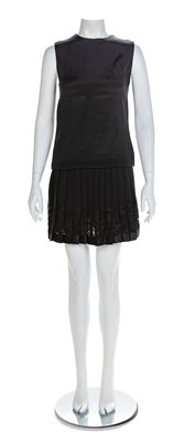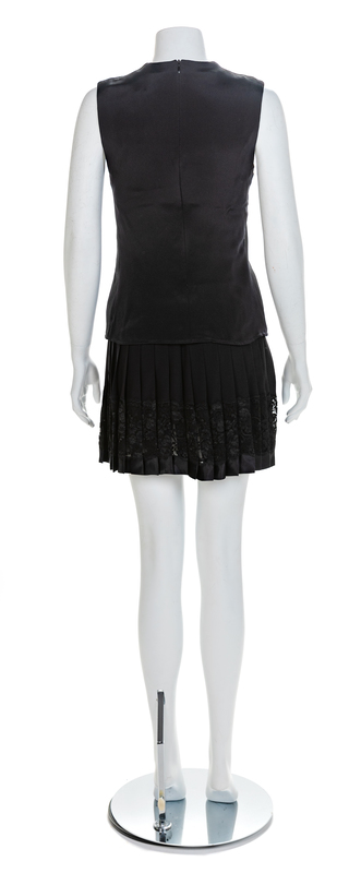 Sleeveless black ribbed silk with a scoop neckline and center back hand-sewn zipper. Topstitched panels of black silk extend down the side and shoulder seams. The black silk sheer lining and ribbed silk facings are sewn almost entirely by hand. The silk crepe skirt features lace insertion near the hem, a black silk satin waistband and side zip and hook and eye closure - all hand-sewn.