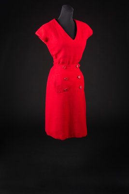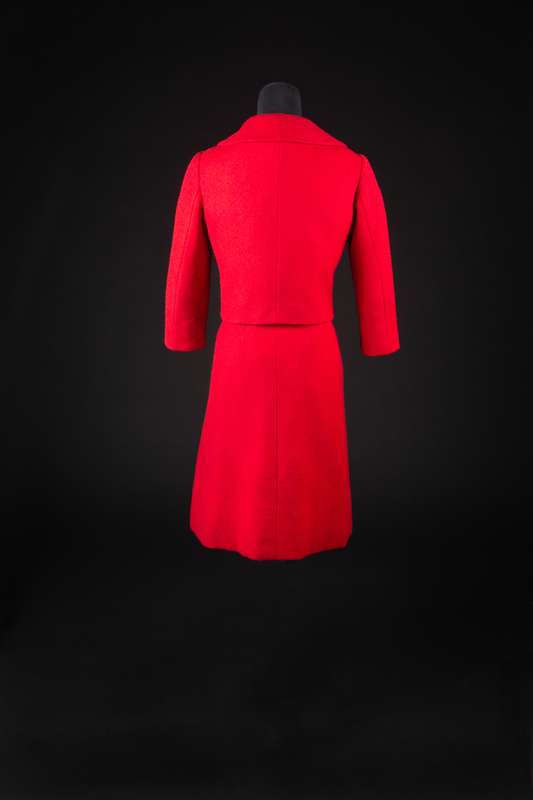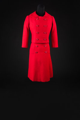 Ensemble consists of jacket, skirt and bodice of red wool. The main seams of the ensemble are sewn by machine while the inside, finishing stitches are done by hand. Jacket has a fold-down collar, long sleeves and a double-breasted button closure. The a-line skirt repeats the closing on the jacket. The bodice has a v-necline, cap sleeves and a silk panel, which extends below the waistline to tuck in. The bodoce closes down the center back with a zip.