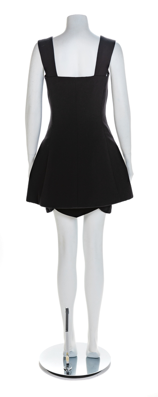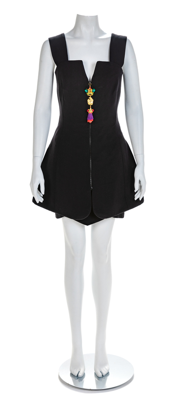 Sleeveless black silk bodice with wide shoulder straps, fitted body and center front separating zipper closure with two goldtone and rhinestone crowns and thread tassel. The waist and hips of the bodice are underlined with a stiff material to help support the exaggerated silhouette. The black silk lining is sewn in by hand. The black tulip skirt has a scalloped hem and is closed at the side seam with a zipper and hook and eye. Black silk lining and zipper are sewn in by hand.