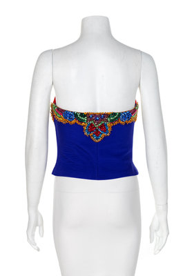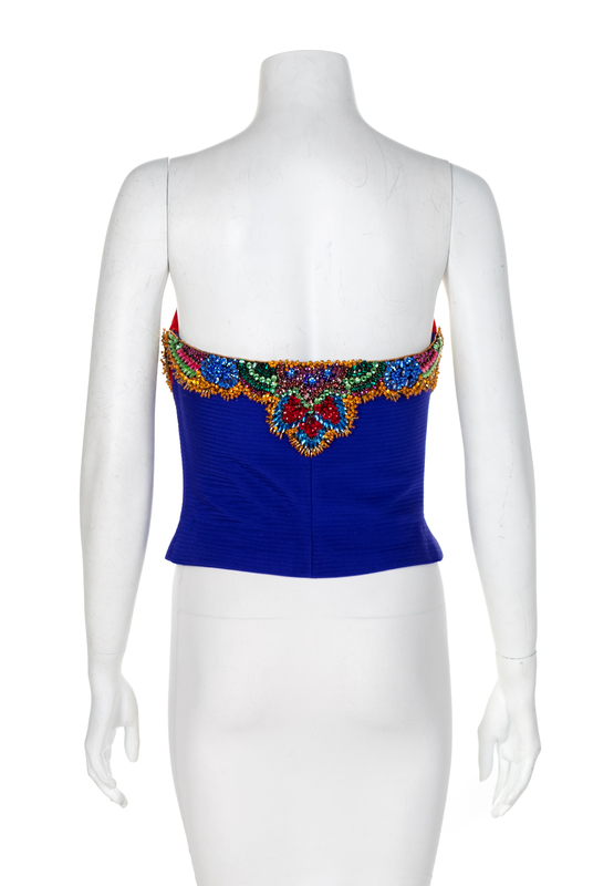 Red and blue bustier with multicolored faceted glass embroidery with sequins. The boned bodice closes with a zip and is lined.
