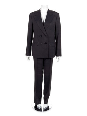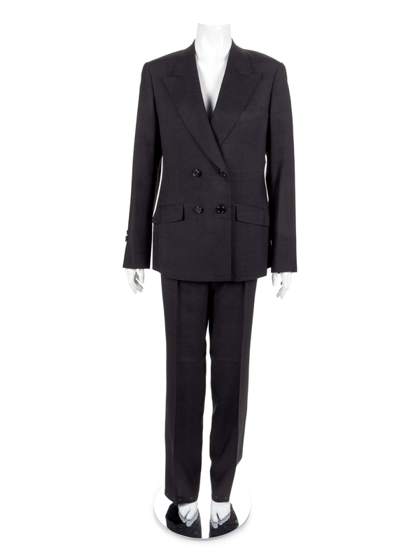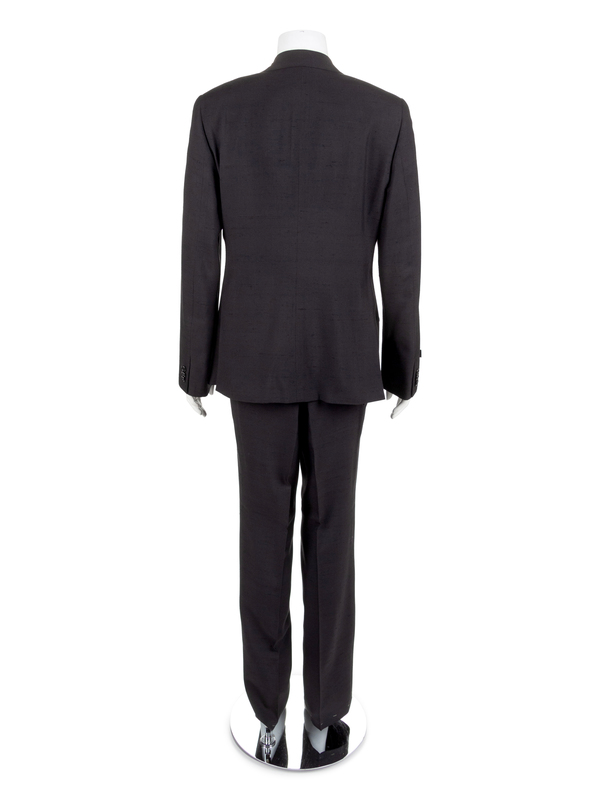 The second is a black raw silk suit with a jacket and pants. The jacket has a notched lapel, long sleeves and a center front button closure. The pants have a straight cut, double pleats and a center front zip closure.