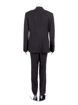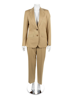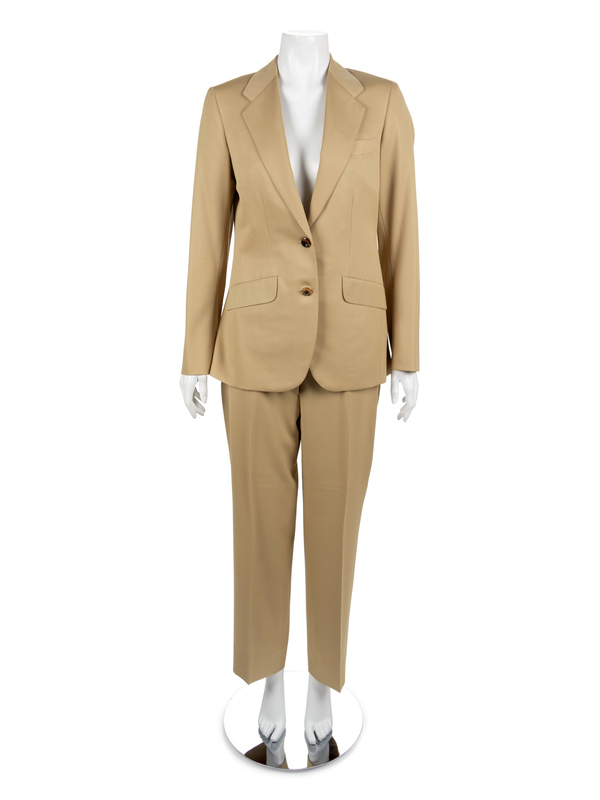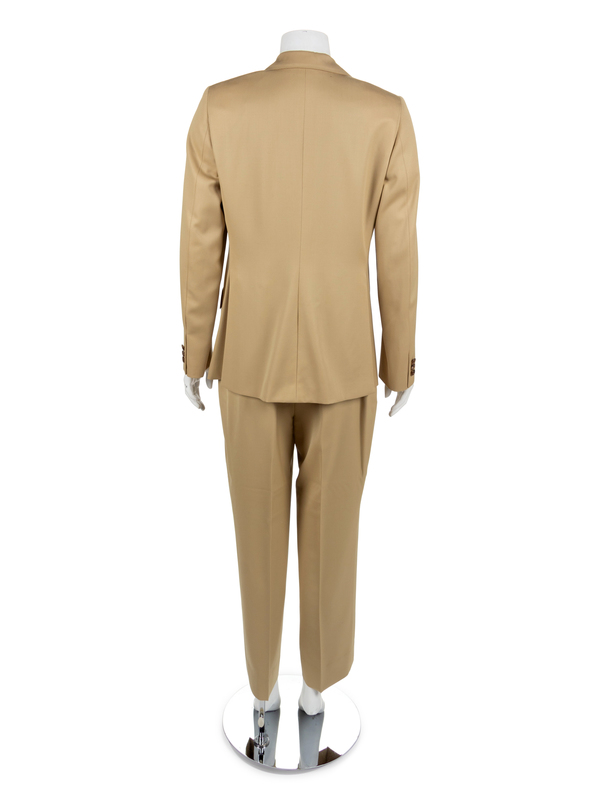 The first is a Tan Super 100s wool suit with a jacket and pants. The jacket has a notched collar, long sleeves and center front button closure. The suit still has tack-stitching left in various areas, which suggests the suit was never worn. The pants have a straight cut, double pleats and a center front zip closure.